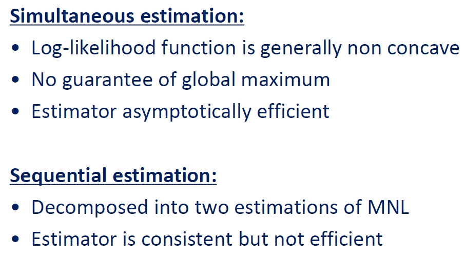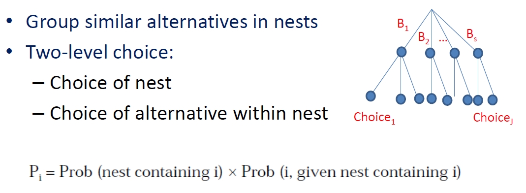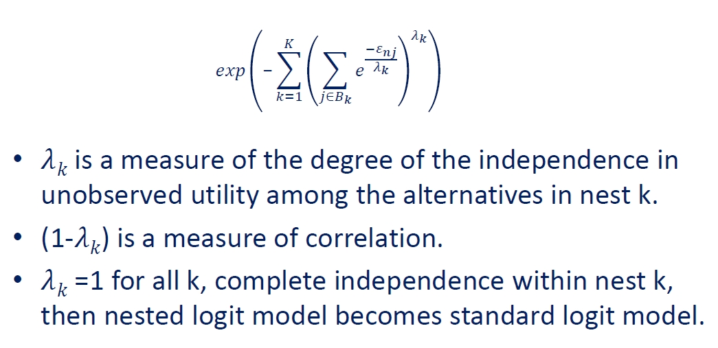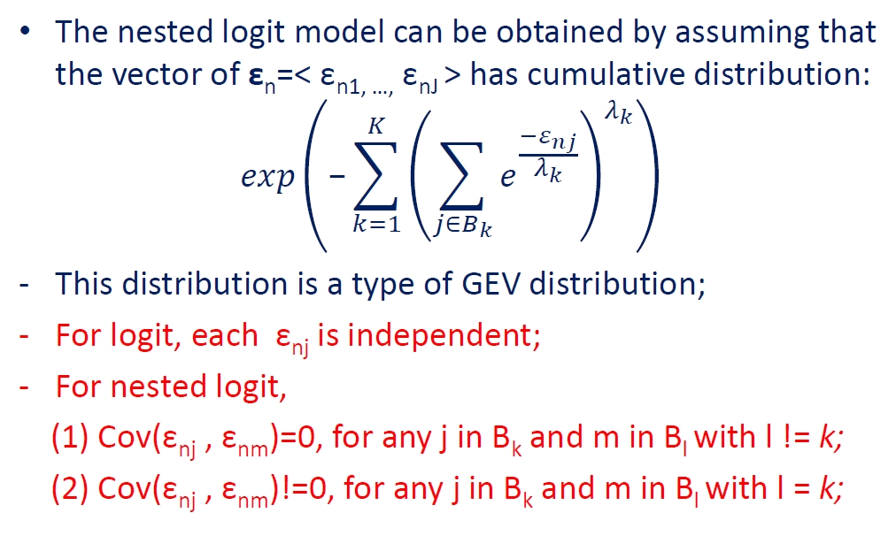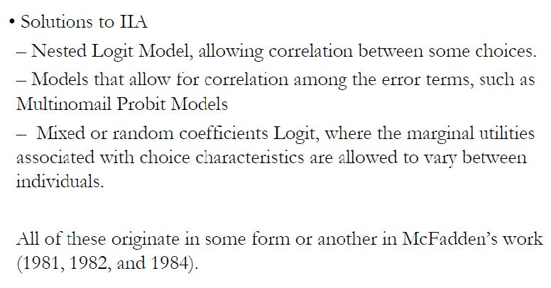 •The i.i.d assumption essentially created the IIA property of Logit model. •This is not completely correct, because other distributions for the unobserved, say with normal errors, we would not get IIA exactly, but something pretty close to it. •We need to relax the independence between the unobserved error term ε