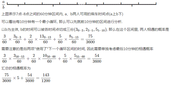 b在0到3分钟与a相遇的概率是:3/60 *3/60,即a也要在前3分钟到达,才可能与b相遇。到第3分钟的时候,b肯定上车了。