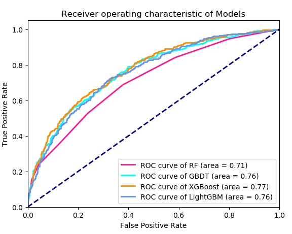 在上次实验中,使用了逻辑回归、SVM和决策树三个模型,本次实验的目的是使用更高级的模型,并添加更多评价指标。本次实验会构建随机森林、GBDT、XGBoost和LightGBM这4个模型,并对每一个模型进行评分。