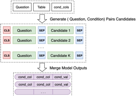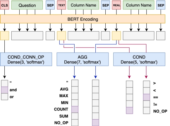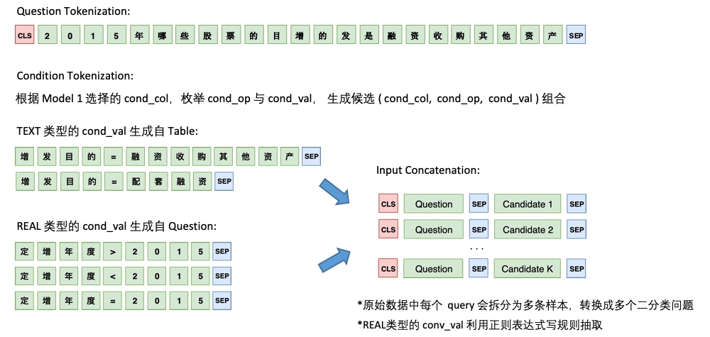 ,生成一系列的候选组合,将这些组合当成多个二分类问题来做。(模型二的输入是question的文本作为first,例如列名='上海'作为second)预测条件列:苏是将标注出来的值的字向量跟每个表头的向量一一算相似度(直接将字向量和表头向量拼接起来,然后过一个全连接层后再接一个Dense(1)),然后softmax。三是将预测条件列和运算符放在一起,将每个表头的text或real和模型对agg的输出拼接,然后softmax预测条件列对应的运算符。(但其实这个运算符在模型二也没用上)