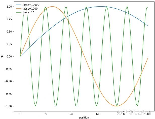 可以看到随着base的变大,周期会明显变长。Transformer选择比较大的base=10000,可能是为了能更好的区分开每个位置。