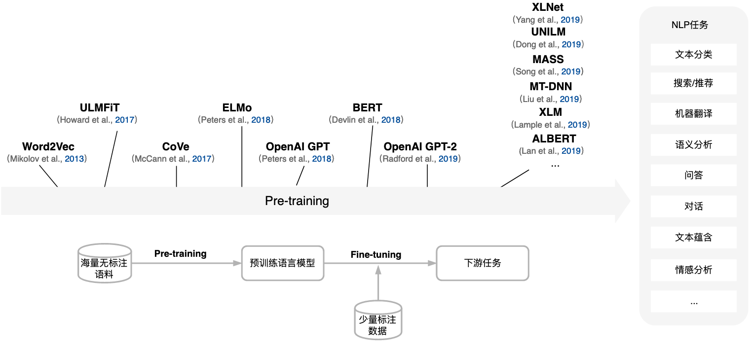 另一种方法是微调(Fine-tuning)。GPT、BERT和后续的预训练工作都属于这一范畴,直接在深层Transformer网络上进行语言模型训练,收敛后针对下游目标任务进行微调,不需要再为目标任务设计Task-specific网络从头训练。关于NLP领域的预训练发展史,张俊林博士写过一篇很详实的介绍[13]。