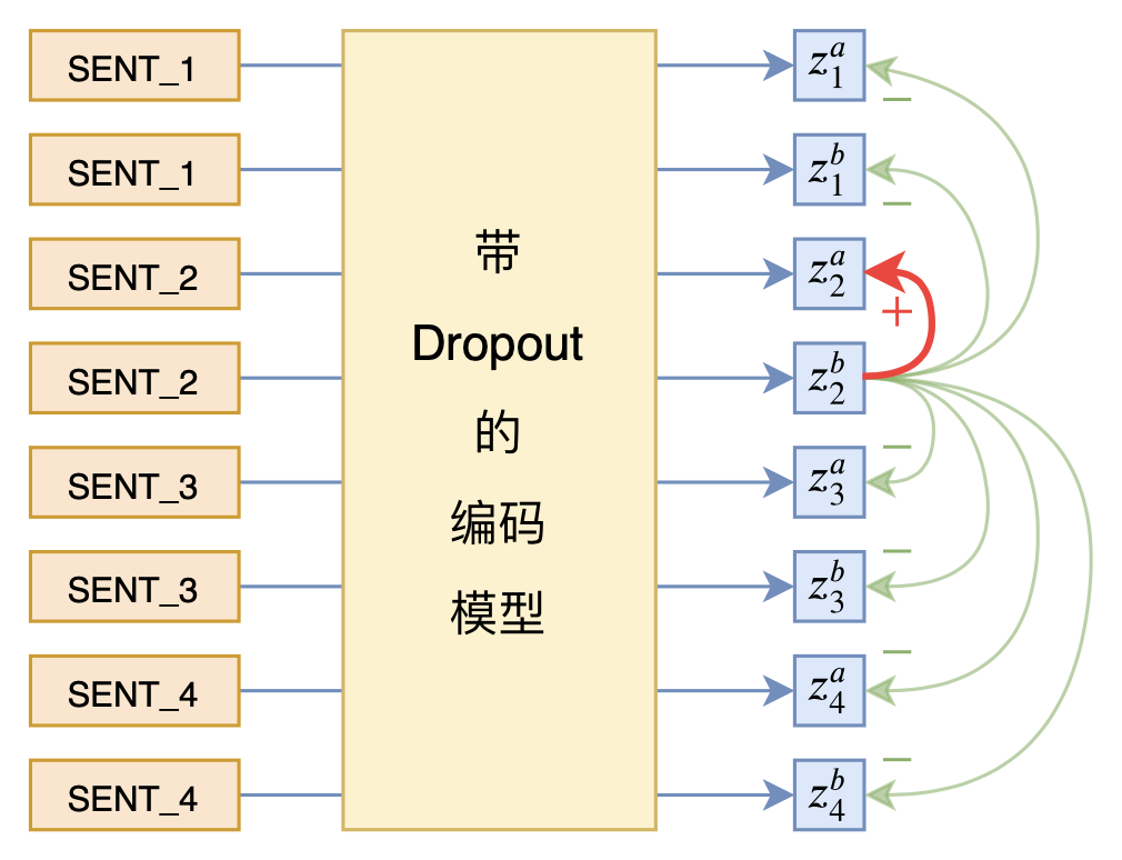 在实现上,SimCSE也相当简单,所谓“Dropout两次”,只需要将样本重复地输入到模型,然后计算相应的loss就行了。由于Dropout本身的随机性,每个样本的Dropout模式都是不一样的,所以只要单纯地重复样本,就可以实现“Dropout两次”的效果。